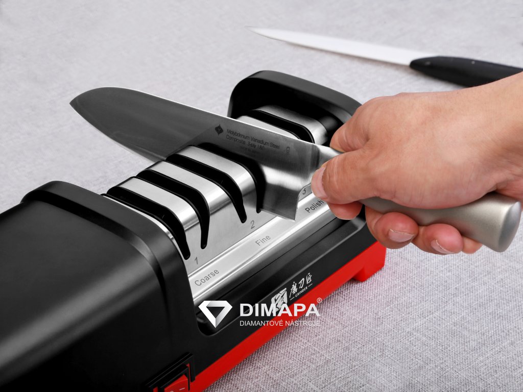 Moderní kuchyňský brusný systém se třemi stupni hrubosti, pro rychlé a jednoduché broušení, které zvládne naprostý začátečník.