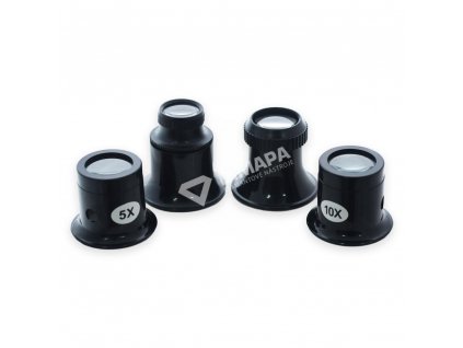 Náhlavní lupa k nasazení na čelo s velkým osvětlením uprostřed (2ks LED) a čtyřmi měnitelnými čočkami.