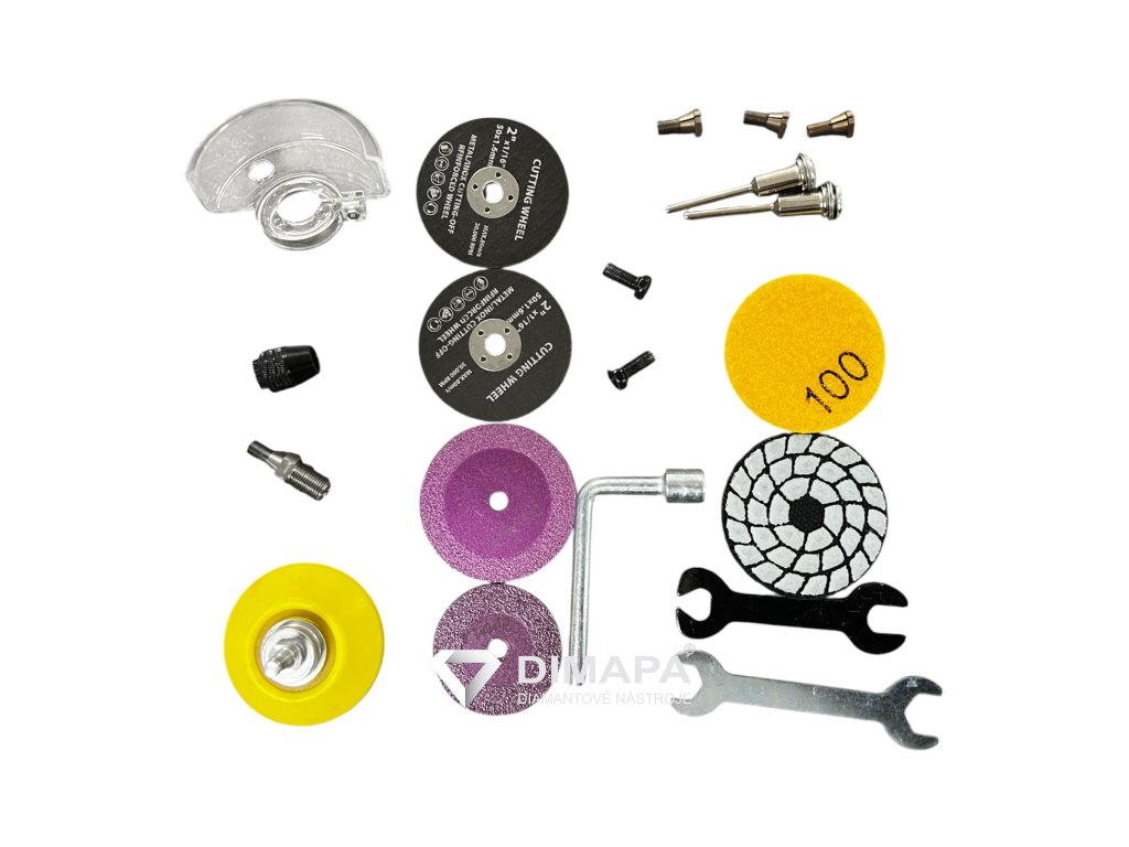 Možnost dokoupit velké množství příslušenství - řezné kotoučky sintrované a diamantové, leštící pady, unašeč, apod.